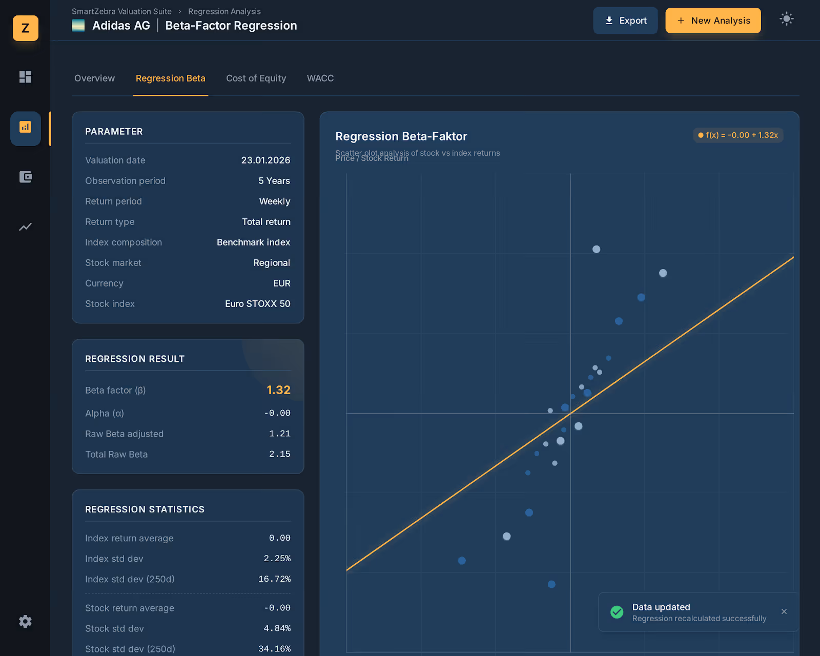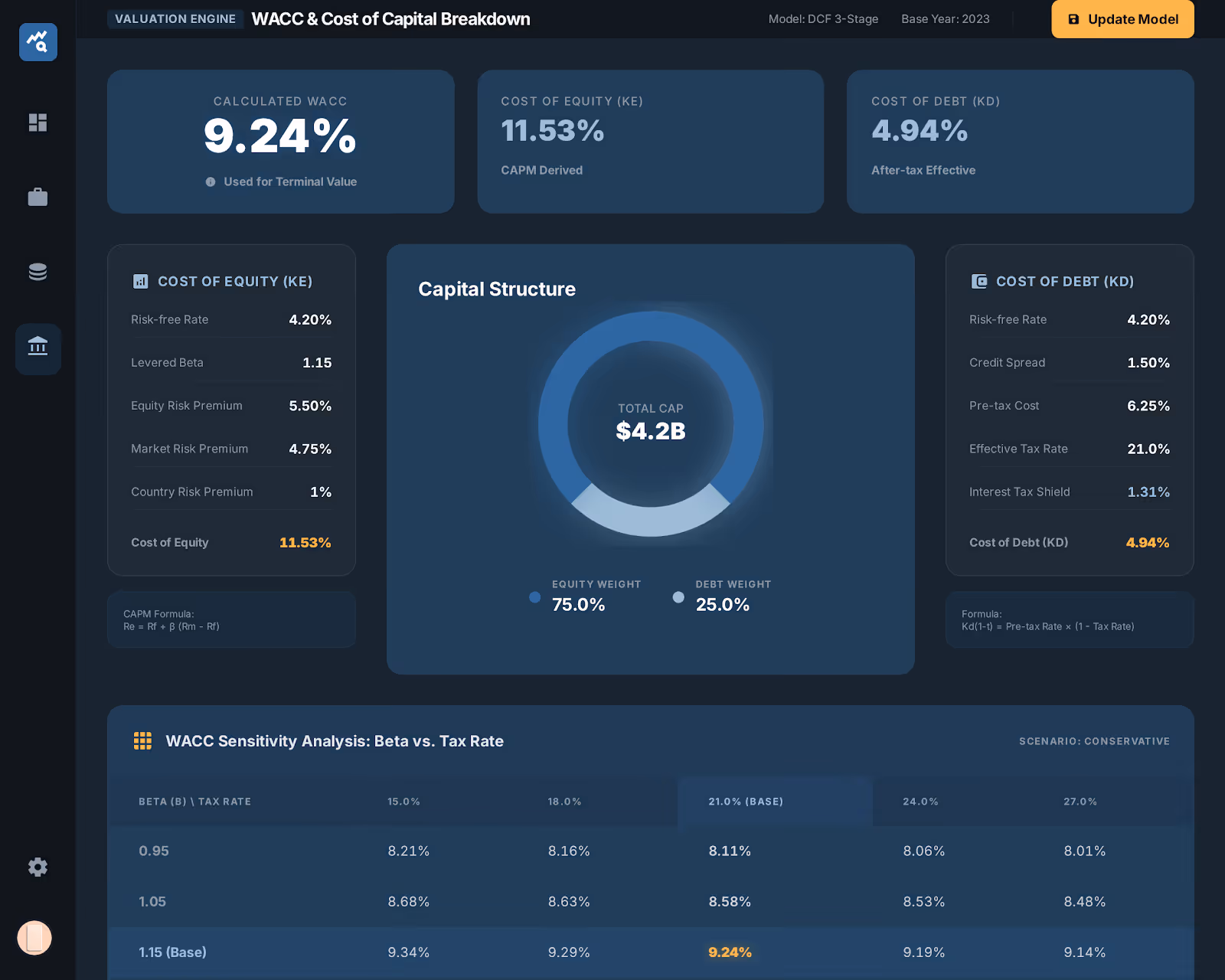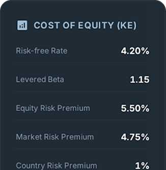 Calculate WACC with precision. Customizable parameters for risk-free rates, market risk premiums, and country risk premiums in a single dashboard.