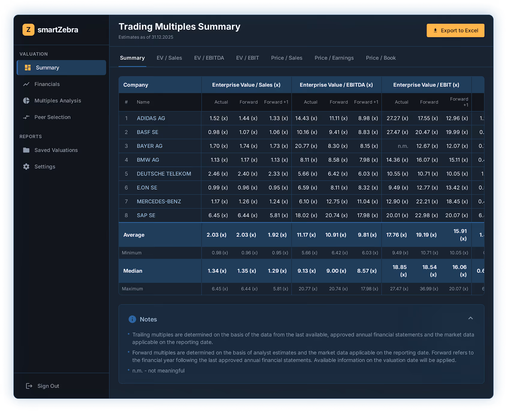 Choose from various financial metrics, available as trailing and forward-looking variants. This allows you to flexibly adapt your analysis to the requirements of your valuation project.